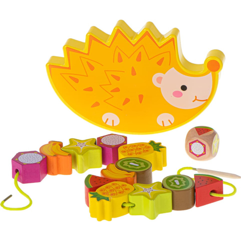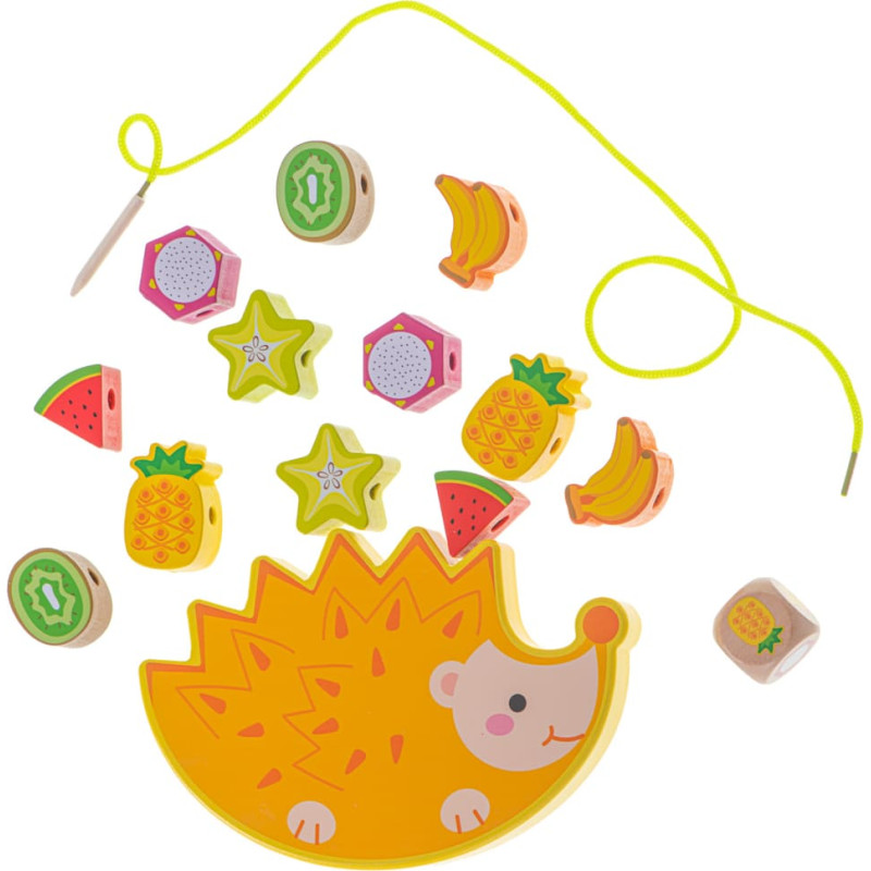 Augļu sakārtošana uz eža tā, lai augļu struktūra nesabruktu. Augļu vītņošana un sakārtošana prasīs lielu veiklību un koncentrēšanos. Gabaliņus var kombinēt pēc vēlēšanās vai mest kauliņus, kas nosaka, kuru augli izmantot kā nākamo. Rotaļlieta nodrošinās bērna vispusīgu attīstību: -