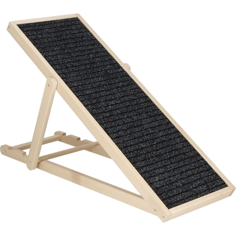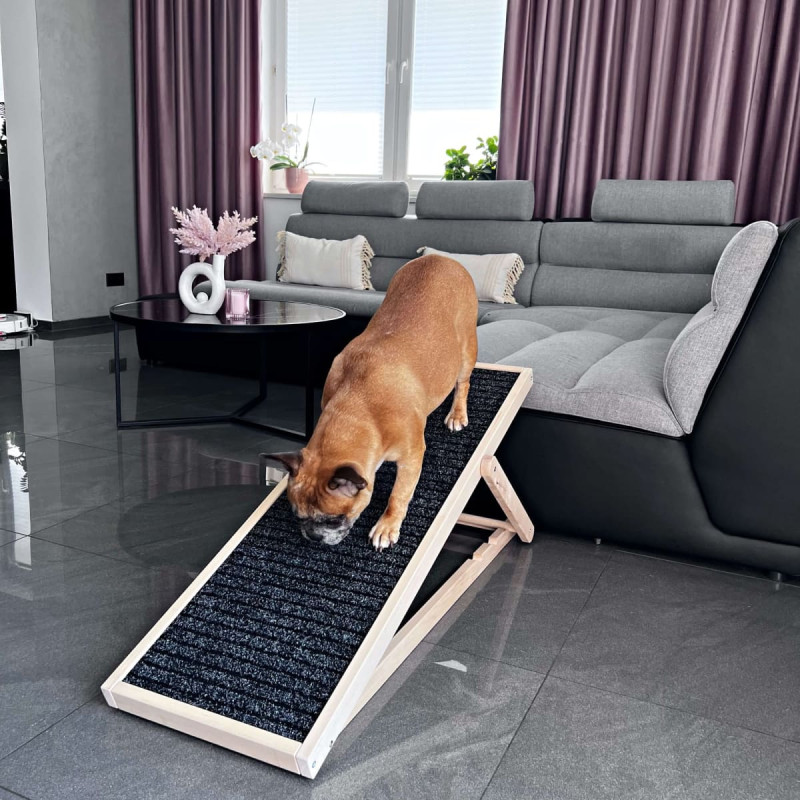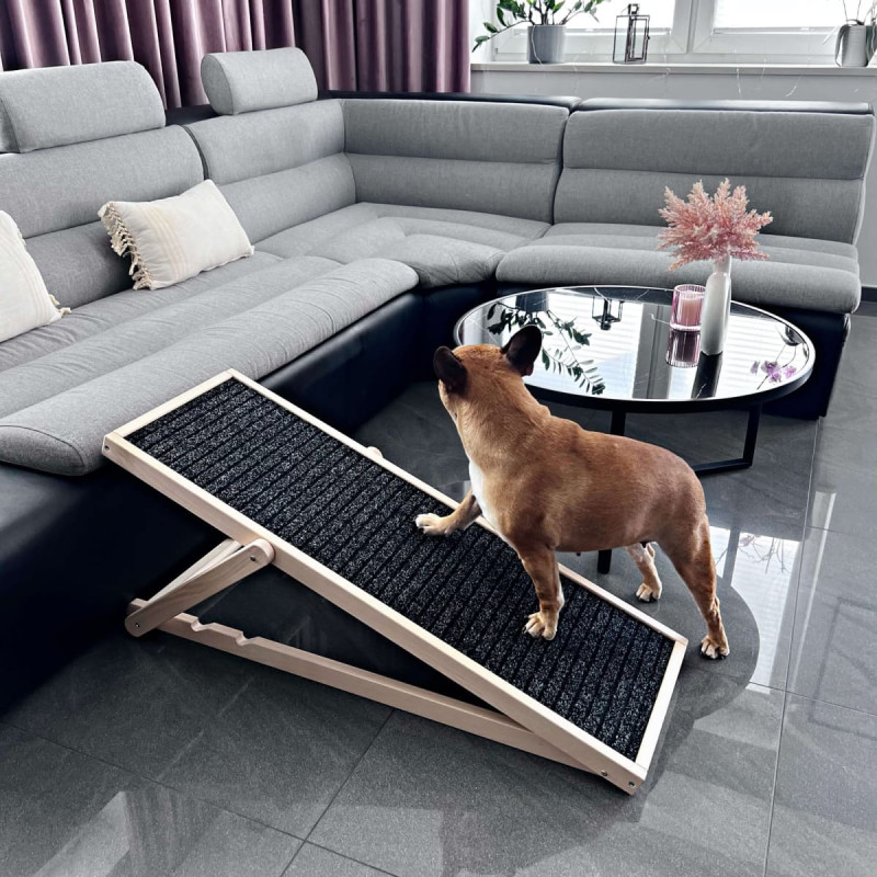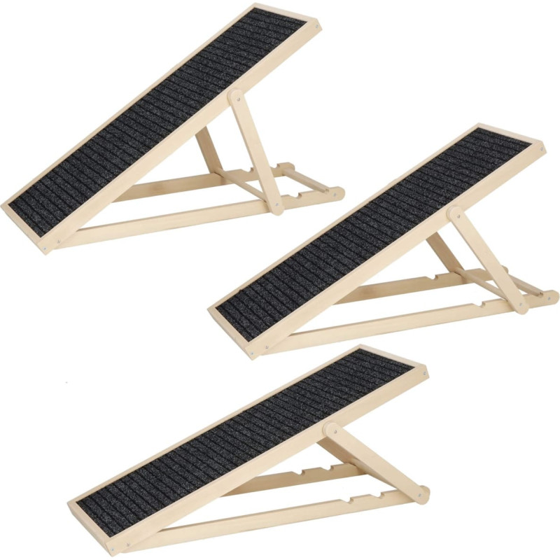Zīmols: Springos® Krāsa: gaiši bēša, melna Materiāls: dižskābarža koks Maksimālā kravnesība: 60 kg Izmēri: Kopējais garums: 103 cm Kopējais platums: 35,5 cm Augstums 1 līmenis: 59 cm Augstums 2 līmenis: 52,5 cm Augstums 3 līmenis: 42,5 cm Plakana augstums: 6 cm Loka biezums: 4,3 cm Auduma izmēri: Garums: apm. 99 cm Platums: apm. 31,5 cm Papildus informācija: Regulējams rampas augstums - trīs līmeņi Rampas dibens - koks