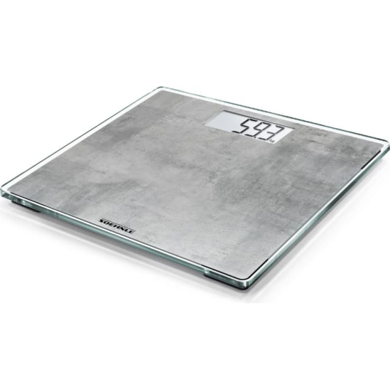 Style Sense Compact 300 Concrete svari ar imitēto betona dizainu ir acij tīkami ikvienā interjerā. Tā virsma, kas izgatavota no augstas kvalitātes droša stikla, piedāvā ērtu statīvu un celtspēja līdz 180 kg. Tiklīdz jūs uzkāpjat uz svēršanās virsmas, skala ieslēdzas un viegli nolasāms svars (cipara augstums 2.5cm). Pēc svēršanas tas automātiski izslēdzas - tas ietaupa enerģiju un ļauj ilgstoši izmantot komplektācijā iekļautās baterijas. Bateriju nodalījums ir cieši pieskrūvēts, tādējādi nodrošinot drošību. - LCD ekrāns vieglai svara nolasīšanai (cipara izmērs ir 2,5 cm)